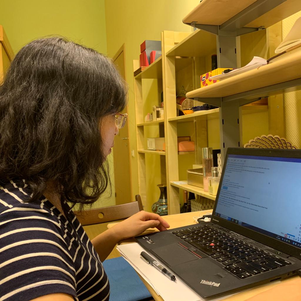 今天的教学有点小体会到网上教学的一些优势。例如,学生的回答都可以呈现在屏幕上,便于更多的同学们参与、围观、互学,也便于老师及时发现问题。例如今天的课文阅读理解题就有两位同学的回答有偏差,在随后的讲解中我就着重分析了那两题。又如,在同学们自由分享时,我浏览到了一些语言问题,立刻进行了指正。但是也有一些麻烦,分享的信息多了些,不能全部看完。今后要在节奏和量上面探索更好的课堂把控。
