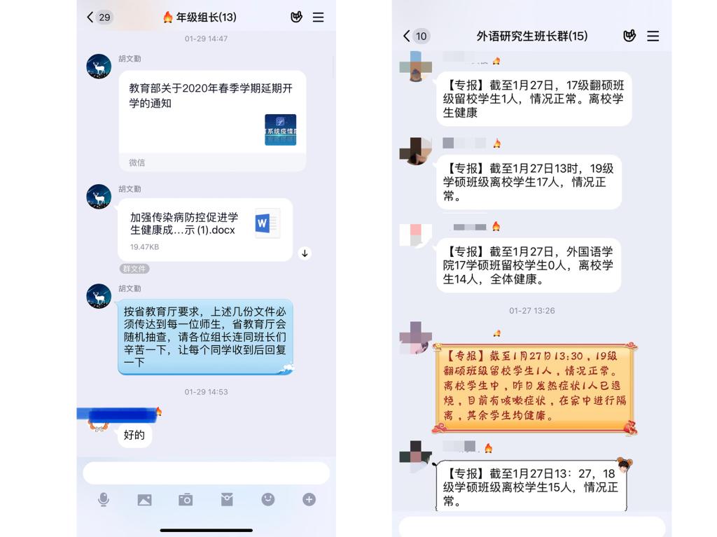 1.落实平安日报制度。1月24日,从一声声“新春快乐,平平安安”开始,bat365中文官方网站开始了同学们每天的平安报告,坚持“零报告”制度,做到本研学生100%全覆盖。与此同时,学院辅导员通过年级群、班长群、学务指导和班主任群、学生党员群、家长群等做好疫情防控的引导宣传工作,时时转发科学防疫注意事项以及相关工作通知。