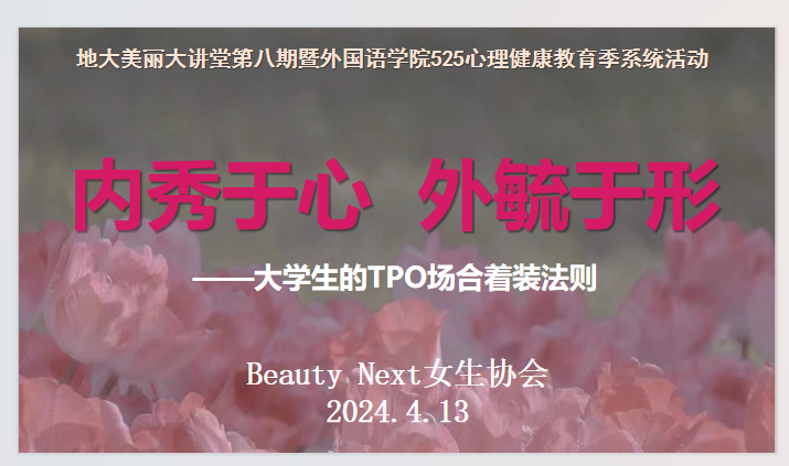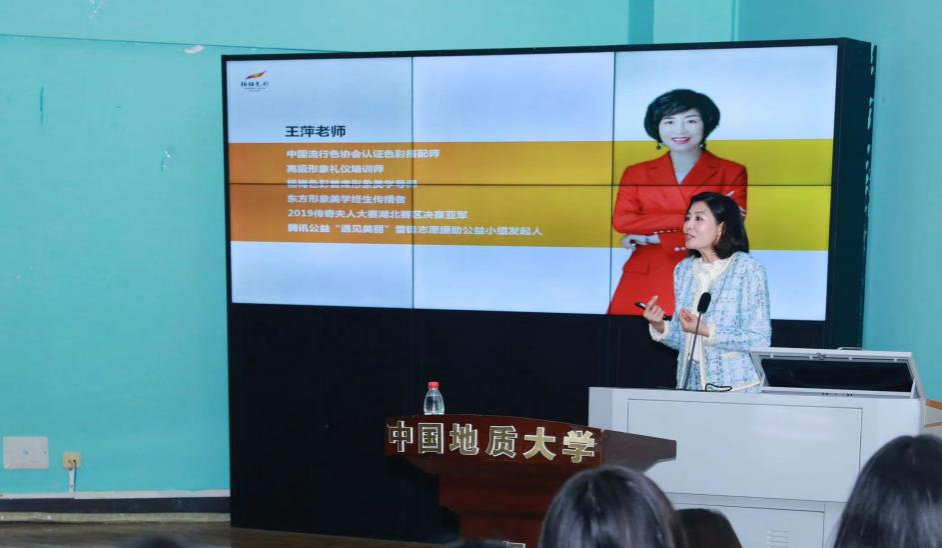 作为外国语学院红外·线大思政课堂审美素养提升的重要载体和“525”心理健康教育季系列活动,由中国地质大学(武汉)bat365中文官方网站主办、Beauty Next女生协会承办的美丽大讲堂第八期“内秀于心 外毓于形”于4月12日下午15:00,在北一楼报告厅正式开讲。本次活动特邀资深专家——美丽大讲堂第八期特邀嘉宾王萍老师讲授大学生TPO场合着装法则,Beauty Next女生协会及bat365中文官方网站的诸位同学参加本次讲座。