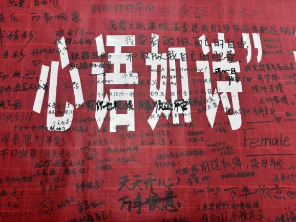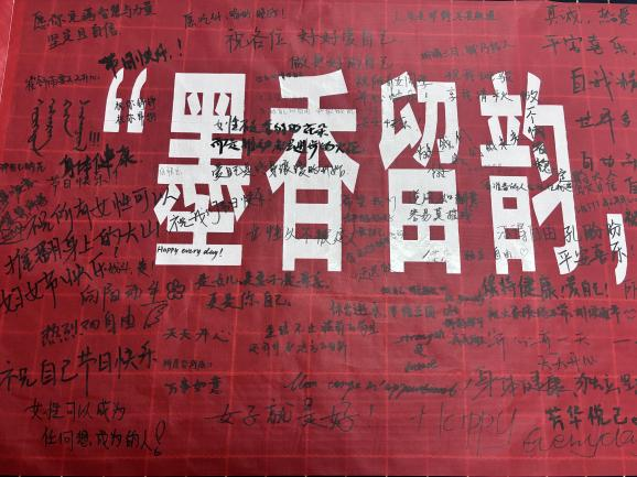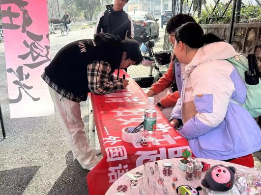 活动横幅上,马克笔的轻盈滑动留下了珍贵的祝福和留言,宛如一首首悠扬的诗歌,在春风细雨中流传永恒。“天天开心,万事顺意”、“无畏世俗,从容自信”、“前途似海,来日方长”.......同学们用心书写的期许与祝福,字字句句都饱含着无限的期待与美好的节日祝愿。老师们也和同学们一起参与这次活动,一同传播着节日的爱与祝福。
