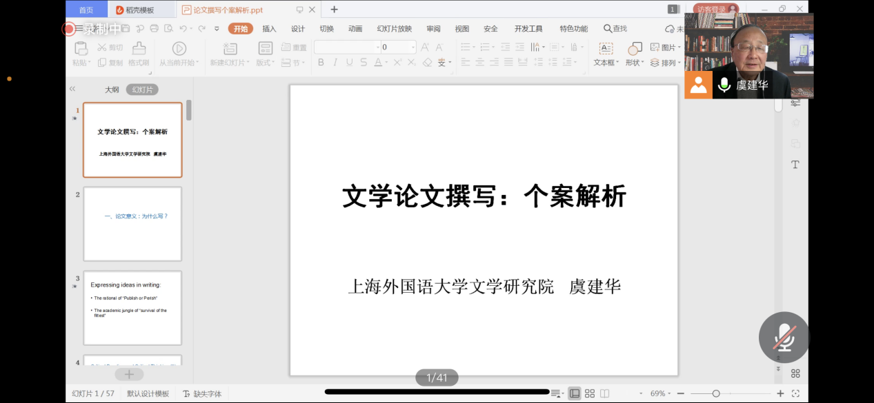 (通讯员:黄皓亮 金梓轩)2021年11月25日下午14:00,bat365中文官方网站“南望今声”外语论坛系列讲座如期召开。上海外国语大学文学研究院的虞建华教授应邀为bat365师生做题为“文学论文撰写:个案解析”的讲座。本次讲座采取了线上腾讯会议直播的形式,bat365共140余名师生参与学习交流。