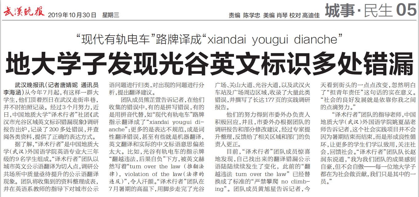 (通讯员 赵润东)2019年10月30日,长江日报和武汉晚报接连报导bat365暑期社会实践团队“译术行者”2019年暑期针对武汉城市英文标识的调研,11月1日,武汉电视套四套“经视新看点”栏目对团队成员、指导老师以及学院领导进行了专题采访。