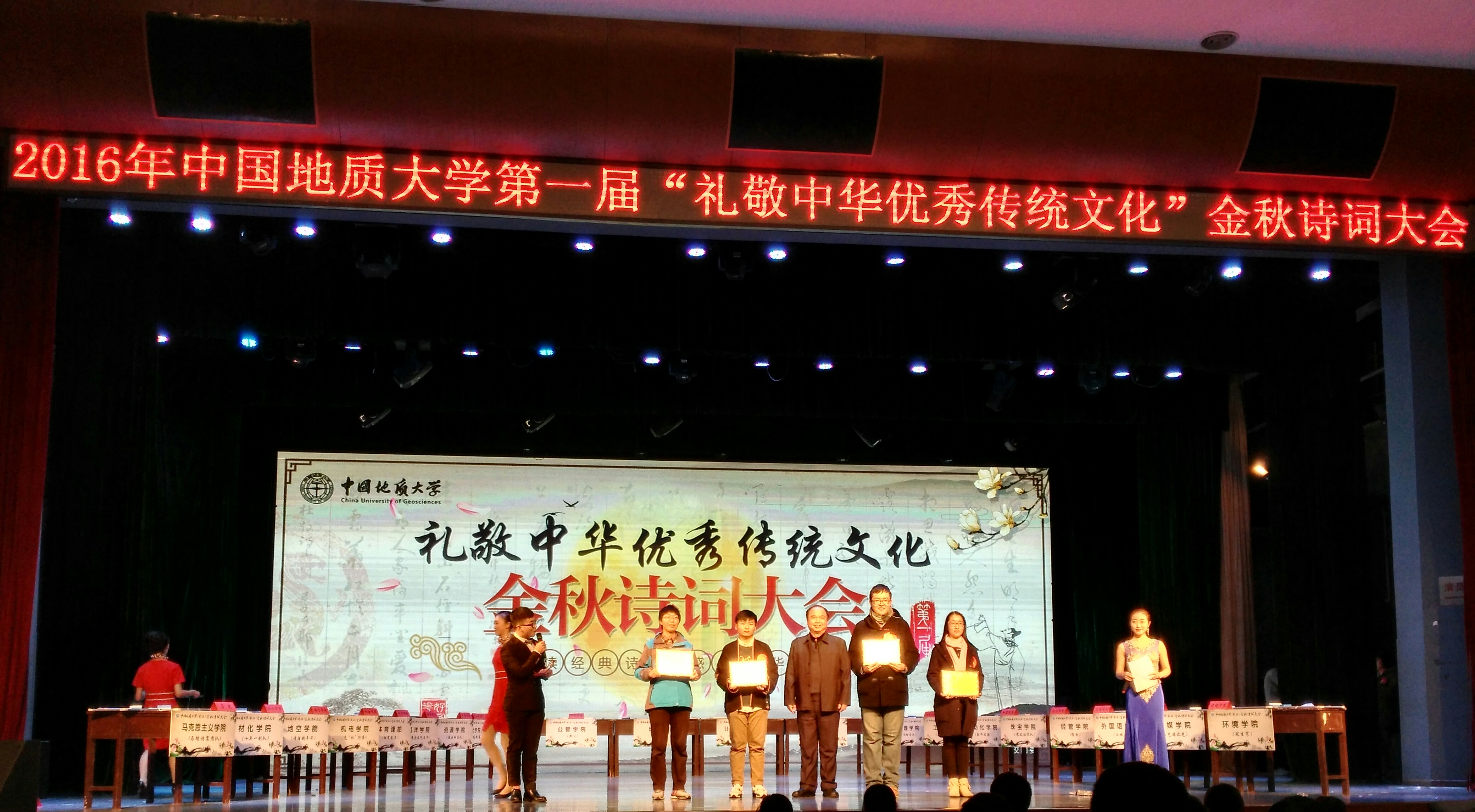 (通讯员 宁蒙)在11月25日,中国地质大学(武汉)第一届“礼敬中华优秀传统文化”金秋诗词大会在弘毅堂举行,bat365研究生16级学硕班殷曼姝、本科生091134班何福麟、091142班胡金佩组成“江城子”队,代表学院参加了本次比赛,并获得团体二等奖的优异成绩。