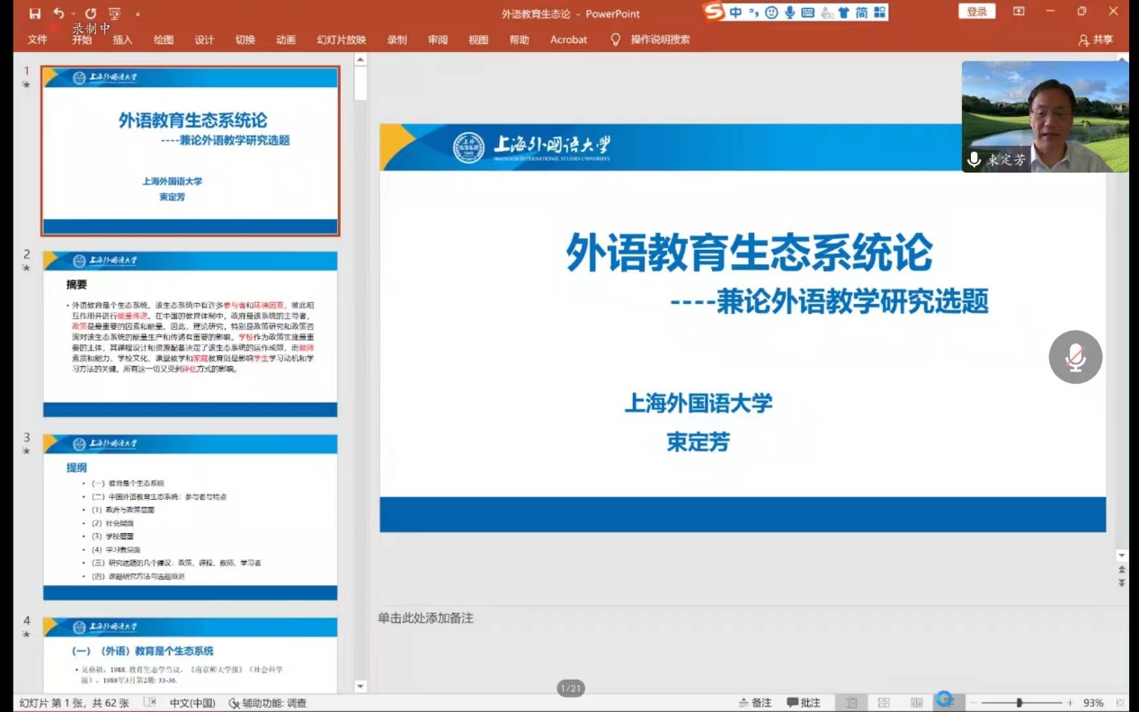 (通讯员 金梓轩 杨红燕)2022年9月22日上午9:30,bat365中文官方网站“南望今声”系列讲座如期举行。上海外国语大学大学博士生导师束定芳教授应邀在线上为bat365师生做了题为“外语教育生态系统论——兼谈外语教育研究课题”的讲座。讲座由bat365中文官方网站副院长张伶俐教授主持,bat365师生共140余人参与了学习交流。