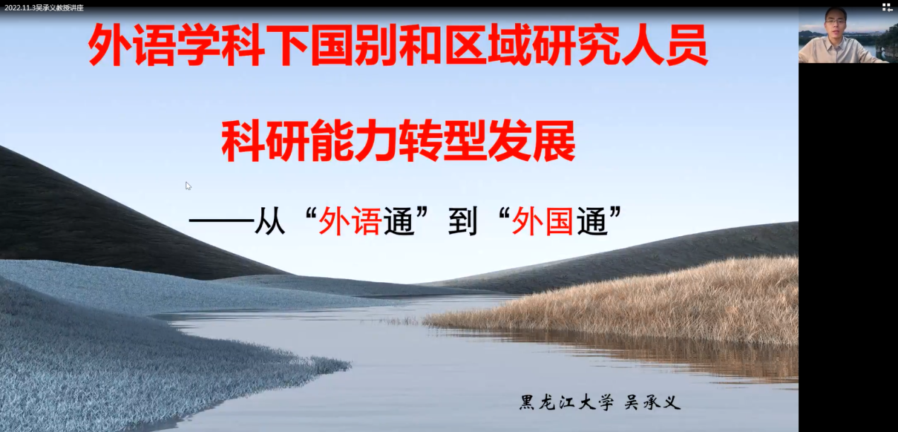 (通讯员 王国念)2022年11月3日下午14时30分,作为校庆70周年系列活动之一的“南望今声”外语论坛第40期在线上如期举行。黑龙江大学吴承义教授应邀为bat365师生做了题为《外语学科下国别和区域研究人员科研能力转型发展:从“外语通”到“外国通”》的讲座。讲座由我校bat365中文官方网站王国念副教授主持,bat365中文官方网站及其他兄弟高校近200名师生参与学习交流。