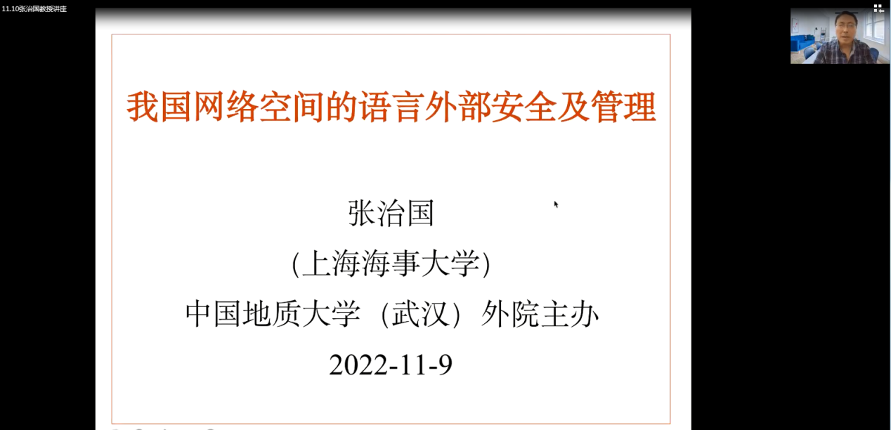(通讯员 张萌)2022年11月9日下午2点30,中国地质大学(武汉)bat365中文官方网站“南望今声”外语论坛系列讲座第四十一期在腾讯会议线上举行。上海海事大学bat365中文官方网站张治国教授应邀做题为“我国网络空间的语言外部安全及治理”的讲座。此次讲座由bat365中文官方网站汪卫红教授主持,学院师生近110人参加。