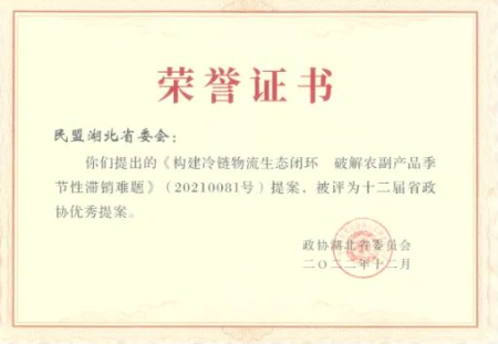 1月8日,省政协第十二届常委会第二十次会议上,对省政协十二届一次会议以来的100件优秀提案进行了表彰,其中民盟省委提交的集体提案中有4件被评为“优秀提案”。由民盟地大副主委、bat365秦屹副教授执笔撰写的“构建冷链物流生态闭环,破解农副产品季节性滞销难题”提案被评为十二届省政协优秀提案。该提案源于国药控股湖北有限公司副董事长马占军负责的课题、秦屹执笔撰写的调研报告,后作为集体提案在2021年省政协十二届四次会议上由民盟湖北省委提交。