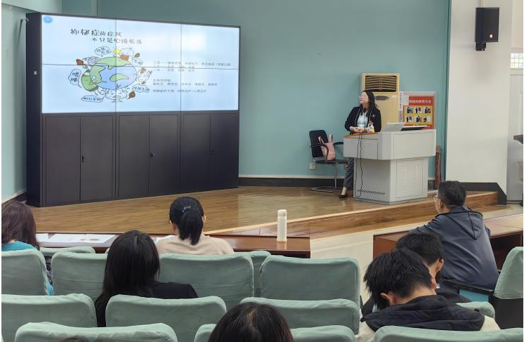 讲座一开始,周老师就运用本科生的有关数据,展示了近几年大学生的心理问题咨询数量和我校学生心理健康的整体状况。周老师表示,近几年学生心理问题咨询量逐年增多,2023年是2019年的1.43倍,学生心理健康状况整体下降的趋势表明,早期心理问题预防与干预工作迫在眉睫。